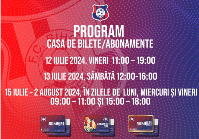 Programul casei de bilete/abonamente este, după cum urmează, cu mențiunea că poate suferi modificări care vor fi anunțate în prealabil pe site-ul fcbihor.ro: