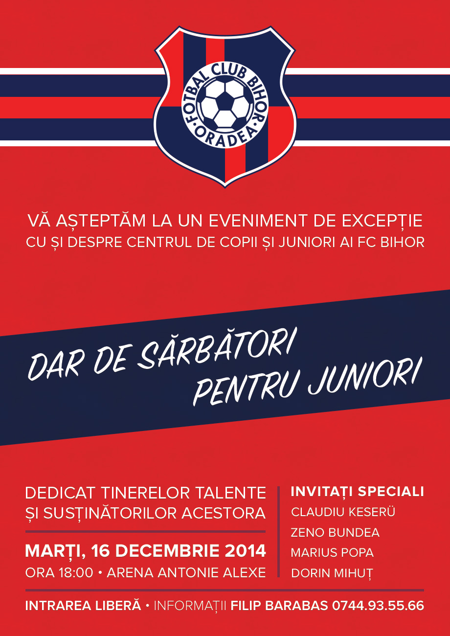 10.12.2014, 13:30În cadrul unui program de promovare al Centrului de Copii şi Juniori al clubului FC Bihor, marţi, 16 decembrie, cu începere de la ora 18, la Arena "Antonio Alexe" va avea loc acţiunea "Dar de sărbători pentru juniori".