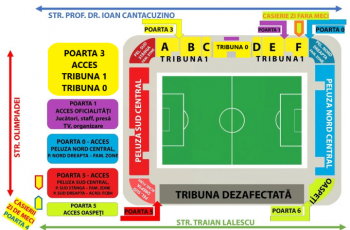 Porțile de acces pentru fiecare sector al stadionului sunt indicate în grafica atașată. Vă rugăm să verificați sectorul și poarta corespunzătoare biletului dumneavoastră pentru un acces facil și rapid.