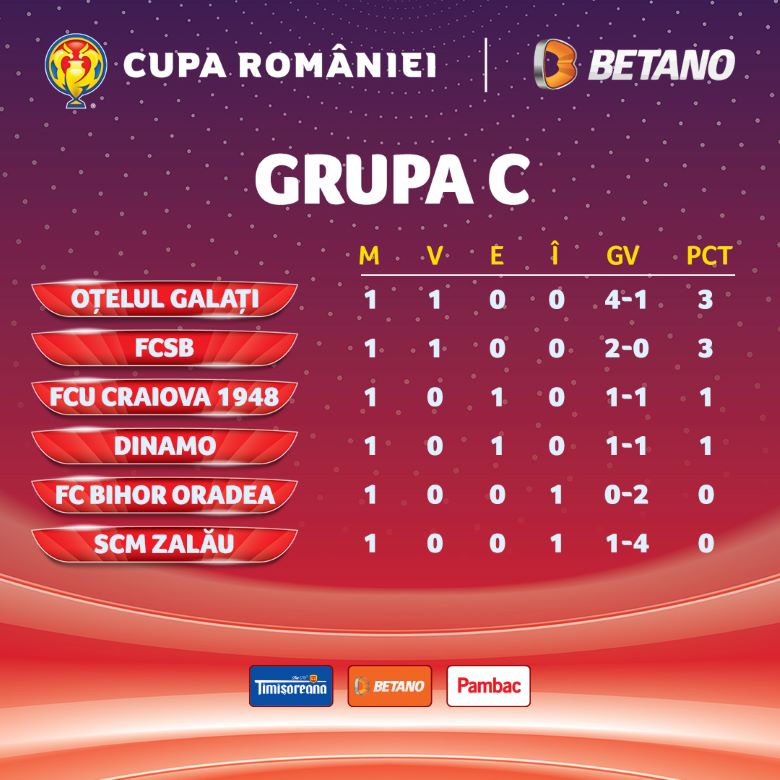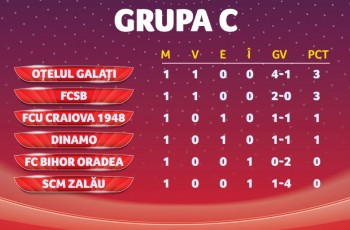 Astfel, în clasament, după prima etapă, Oţelul şi FCSB au câte 3 puncte, FCU 1948 Craiova şi Dinamo au câte un punct, iar FC Bihor şi SCM Zalău sunt fără vreun punct.